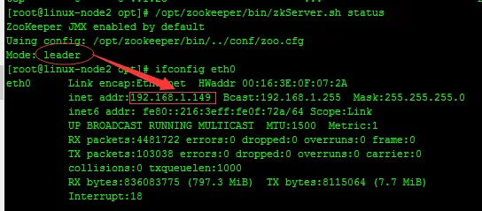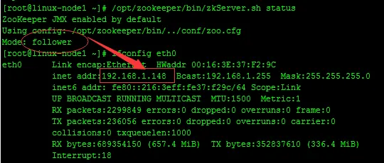 #从上面可以看出,linux-node1,linux-node3两台服务器zookeeper的状态是follow模式,linux-node2这台服务器zookeeper的状态是leader模式。