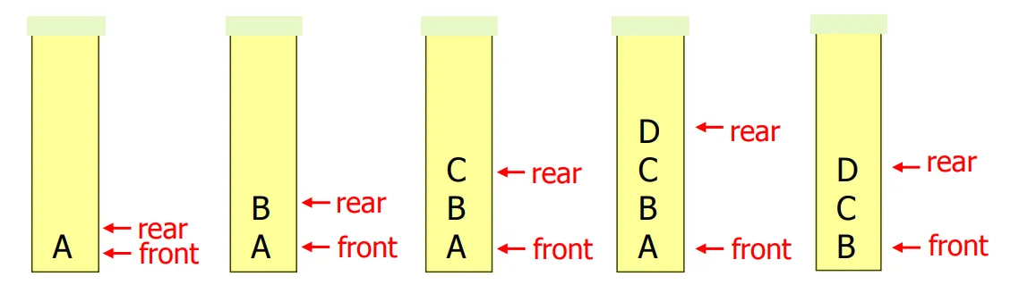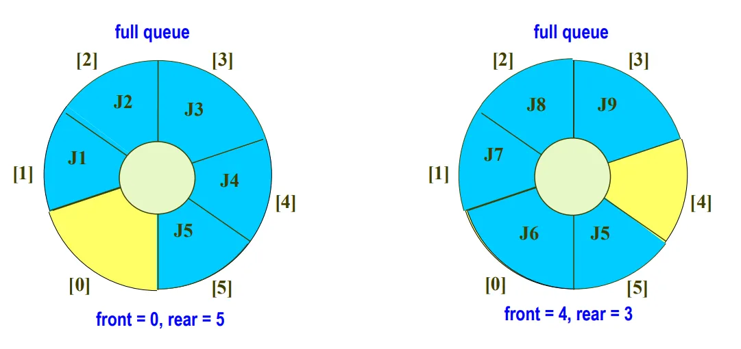 为了区分空队列和满队列,我们采用这样的惯例:一个大小为 MAX_QUEUE_SIZE 的循环队列将被允许最多容纳 MAX_QUEUE_SIZE-1 个元素。