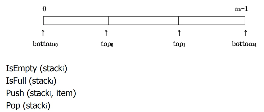 #define MEMORY_SIZE 100 /* size of memory */ #define MAX_STACKS 10 /* max number of stacks plus 1 */ /* global memory declaration */ element memory[MEMORY_SIZE]; int top[MAX_STACKS]; int boundary[MAX_STACKS]; int n; /* number of stacks entered by the user */ top[0] = boundary[0] = -1; for (i = 1; i < n; i++) top[i] = boundary[i] = (MEMORY_SIZE / n) * i; boundary[n] = MEMORY_SIZE - 1;