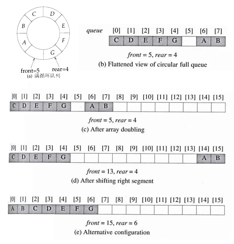 要向一个完整的队列添加一个元素,我们须先使用 realloc 等函数增加这个数组的大小。