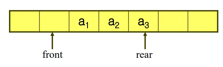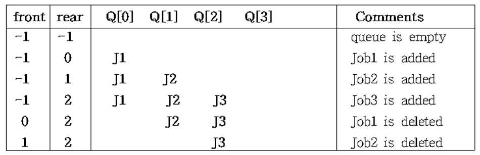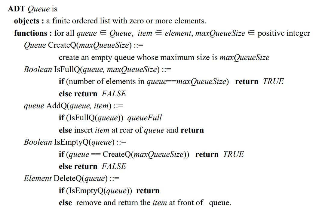 Queue CreateQ(maxQueueSize) :: = #define MAX_QUEUE_SIZE 100 /* maximum queue size */ typedef struct { int key; /* other fields */ } element; element queue[MAX_QUEUE_SIZE]; int rear = -1; int front = -1; Boolean IsEmptyQ(queue) :: = front == rear; Boolean IsFullQ(queue) :: = rear == MAX_QUEUE_SIZE - 1;