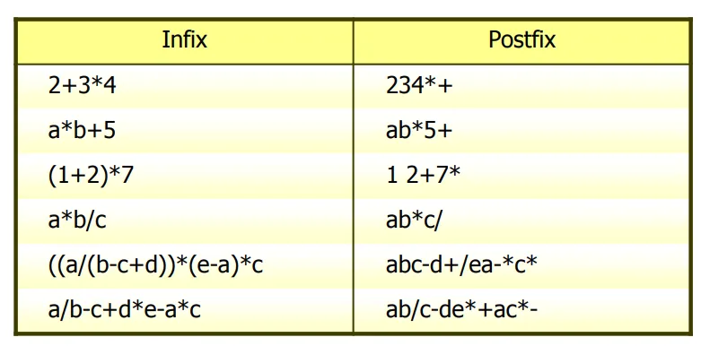 #define MAX_STACK_SIZE 100 /*maximum stack size*/ #define MAX_EXPR_SIZE 100 /*max size of expression*/ typedef enum {lparen, rparen, plus, minus, times, divide, mod, eos, operand} precedence; int stack[MAX_STACK_SIZE]; /* global stack */ char expr[MAX_EXPR_SIZE]; /* input string */