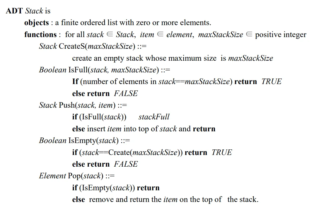 Stack CreateS() :: = typedef struct { int key; /* other fields */ } element; element* stack; MALLOC(stack, sizeof(*stack)); int capacity = 1; int top = -1; Boolean IsEmpty(stack) :: = top < 0; Boolean IsFull(stack) :: = top >= capacity - 1; void stackFull() { REALLOC(stack, 2 * capacity * sizeof(*stack)); capacity *= 2; }