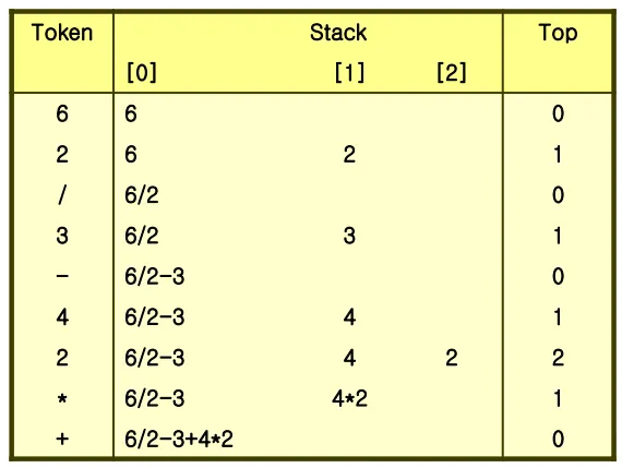 precedence stack[MAX_STACK_SIZE]; /* isp and icp arrays -- index is value of precedence lparen, rparen, plus, minus, times, divide, mod, eos */ static int isp[] = {0, 19, 12, 12, 13, 13, 13, 0}; static int icp[] = {20, 19, 12, 12, 13, 13, 13, 0};