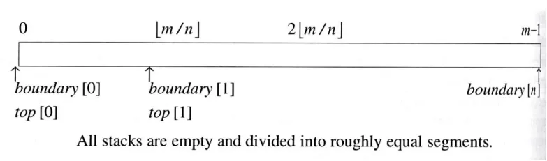 假设有n个堆栈,最初我们将可用的内存分为n个段。让 stack_no 指 n个堆栈中的一个堆栈编号。 底层元素,boundary[stack_no],0≤stack_no<MAX_STACKS,总是指向紧靠底层元素左边的位置,而top[stack_no],0≤stack_no<MAX_STACKS,总是指向顶部元素。