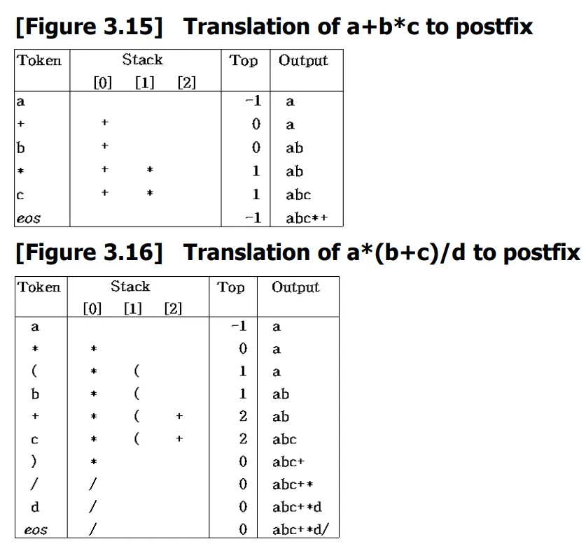 void postfix(void) { /* output the postfix of the expression. The expression string, stack, and the top are global */ char symbol; int n = 0; int top = 0; /* place eos on stack */ stack[0] = eos; for (token = getToken(&symbol, &n); token != eos; token = getToken(&symbol, &n)) { if (token == operand) printf(“ % c”, symbol); else (token == rparan) { /* unstack tokens until left paranthesis */ while (stack[top] != lparen) printToken(pop(&top)); pop(); /* discard the left paranthesis */ } else { /* remove and print symbols whose isp is greater than or equal to the current token’s icp */ while (isp[stack[top]] >= icp[token]) printToken(pop()); push(token); } } while ((token = pop()) != eos) printToken(token); printf(“\n”); }