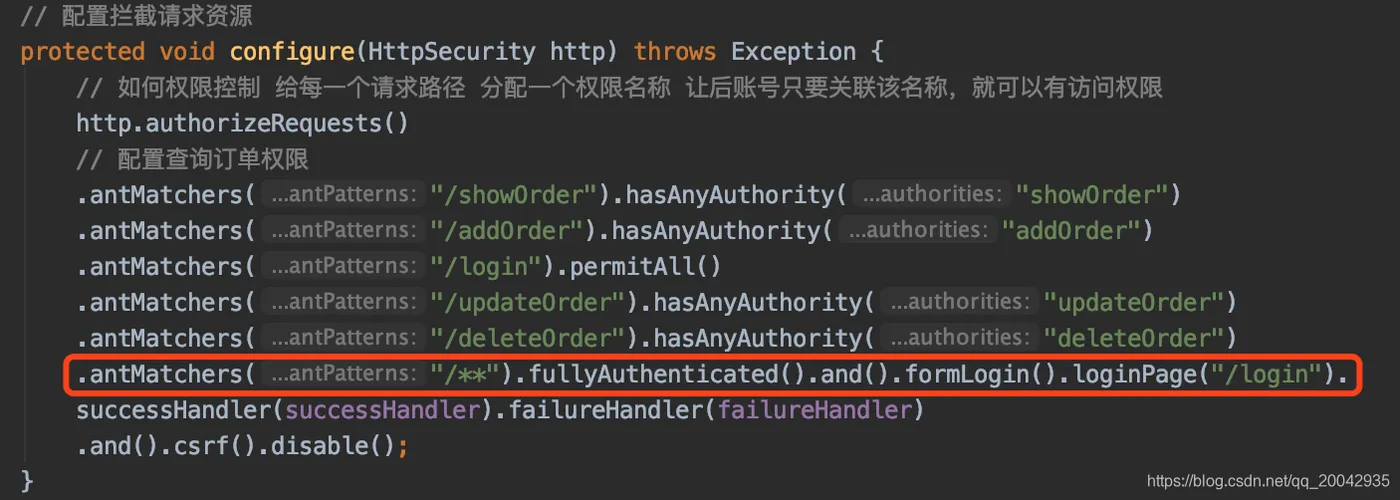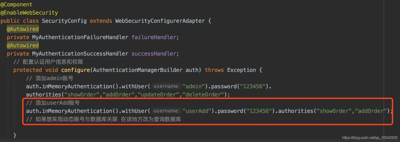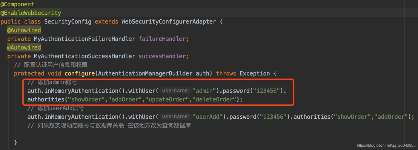 // Security 配置 @Component @EnableWebSecurity public class SecurityConfig extends WebSecurityConfigurerAdapter { @Autowired private MyAuthenticationFailureHandler failureHandler; @Autowired private MyAuthenticationSuccessHandler successHandler; // 配置认证用户信息和权限 protected void configure(AuthenticationManagerBuilder auth) throws Exception { // 添加admin账号 auth.inMemoryAuthentication().withUser("admin").password("123456"). authorities("showOrder","addOrder","updateOrder","deleteOrder"); // 添加userAdd账号 auth.inMemoryAuthentication().withUser("userAdd").password("123456").authorities("showOrder","addOrder"); // 如果想实现动态账号与数据库关联 在该地方改为查询数据库 } // 配置拦截请求资源 protected void configure(HttpSecurity http) throws Exception { // 如何权限控制 给每一个请求路径 分配一个权限名称 让后账号只要关联该名称,就可以有访问权限 http.authorizeRequests() // 配置查询订单权限 .antMatchers("/showOrder").hasAnyAuthority("showOrder") .antMatchers("/addOrder").hasAnyAuthority("addOrder") .antMatchers("/login").permitAll() .antMatchers("/updateOrder").hasAnyAuthority("updateOrder") .antMatchers("/deleteOrder").hasAnyAuthority("deleteOrder") .antMatchers("/**").fullyAuthenticated().and().formLogin().loginPage("/login"). successHandler(successHandler).failureHandler(failureHandler) .and().csrf().disable(); } @Bean public static NoOpPasswordEncoder passwordEncoder() { return (NoOpPasswordEncoder) NoOpPasswordEncoder.getInstance(); } }