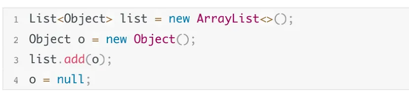 - 内存泄露,⽐如下⾯这段代码,list持有o的引⽤,o暂时是⽆法被JVM垃圾回收的,只有当list被垃圾回收或者o从对象list删除掉后,o才能被JVM垃圾回收。