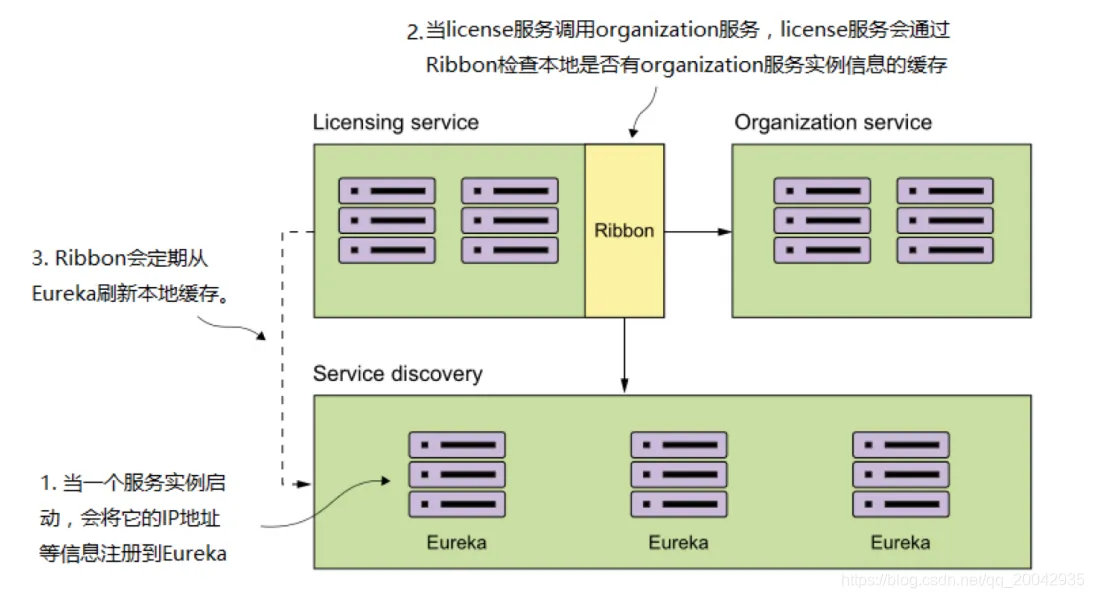 - 注册信息和更新会被复制到其他Eureka 节点,来⾃任何区域的客户端可以查找到注册中⼼信息,每30s发⽣⼀次复制来定位他们的服务,并进⾏远程调⽤。