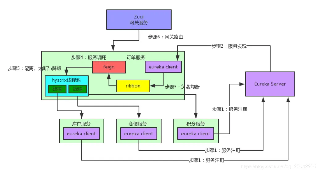 - Eureka:各个服务启动时,Eureka Client都会将服务注册到Eureka Server,并且Eureka Client还可以反过来从EurekaServer拉取注册表,从⽽知道其他服务在哪⾥