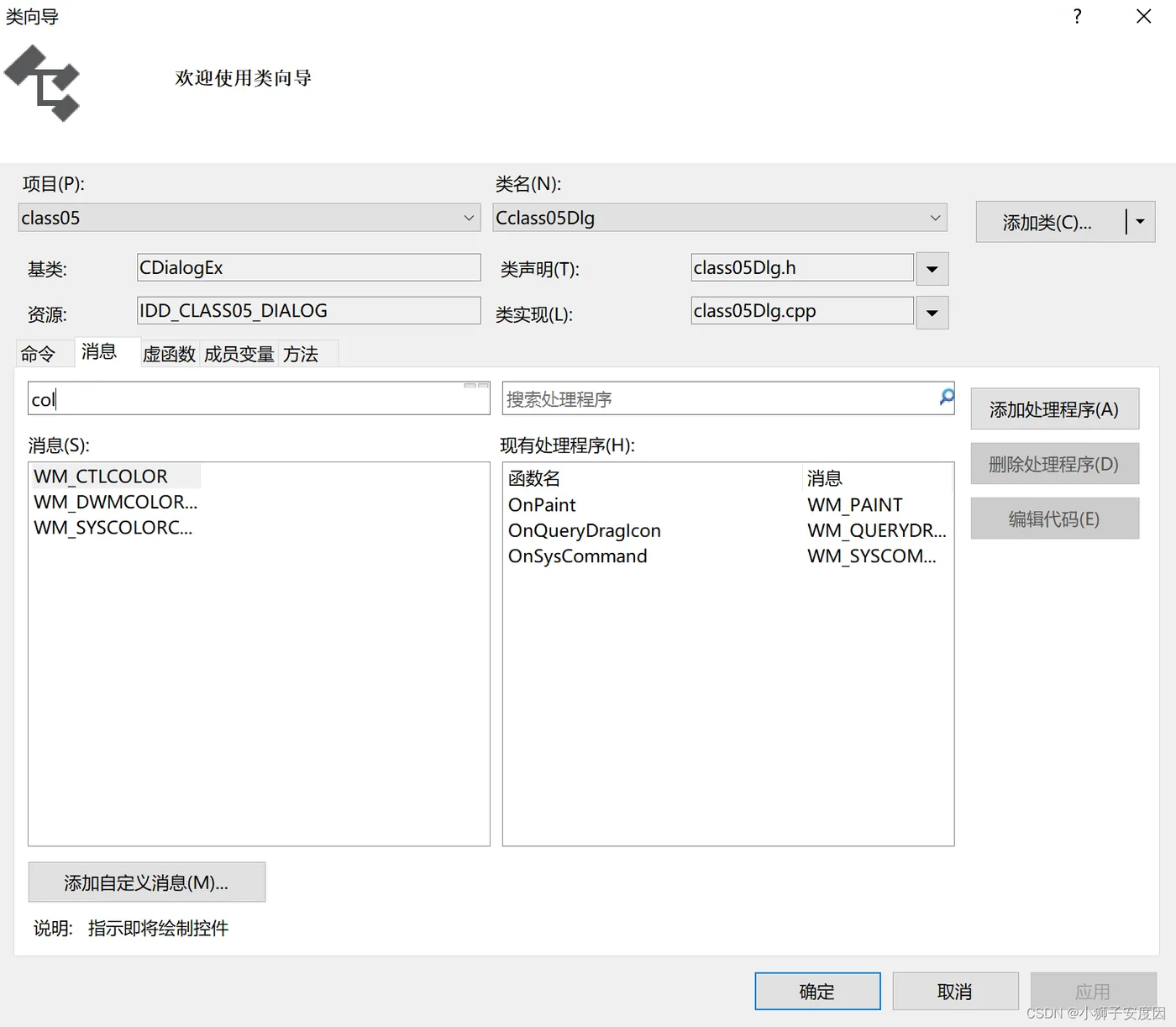 在主窗口的类向导中找到WM_CTLCOLOR消息 , 这是绘制控件消息: