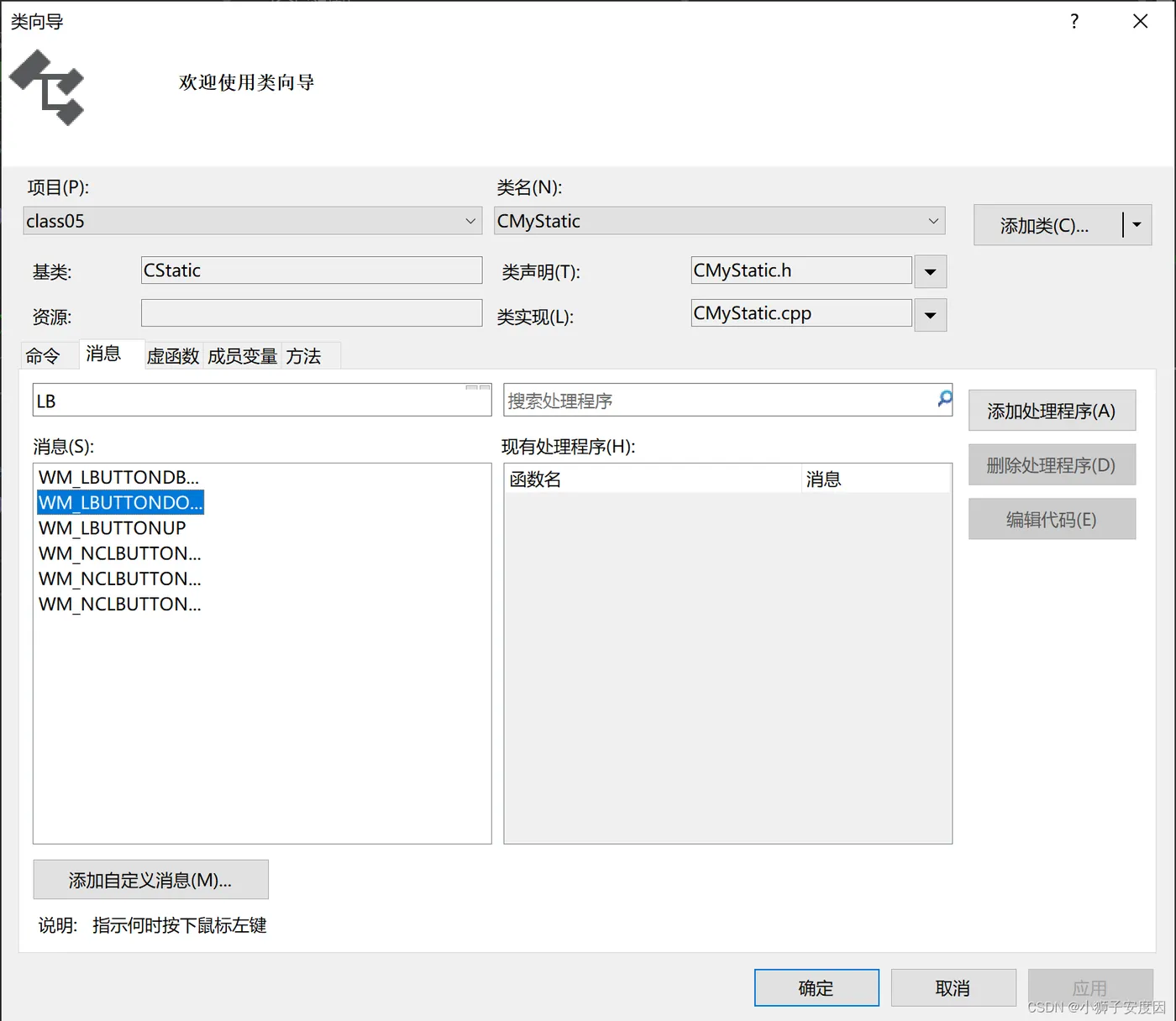 我们再次来到类向导, 在CMyStatic类的的消息中找到左键单击消息,双击,点击应用和确定, 如图: