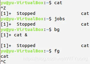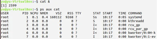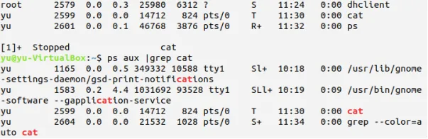 执行cat,按Ctrl+Z组合键,挂起进程cat