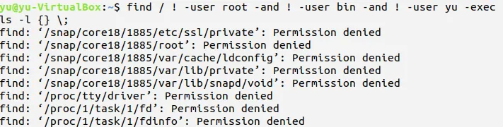 查找所有文件其所有者不是root,bin,student用户并用长格式显示