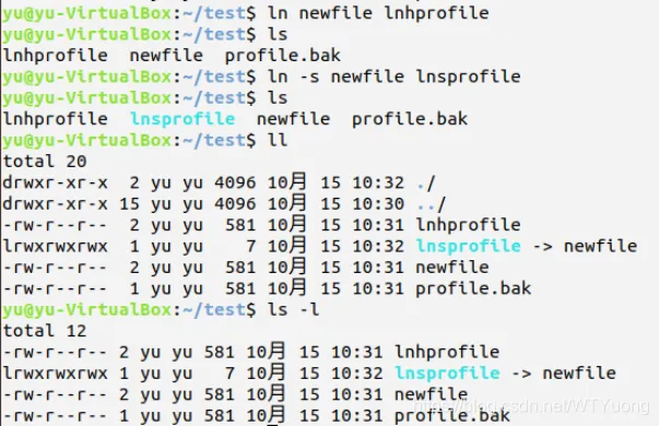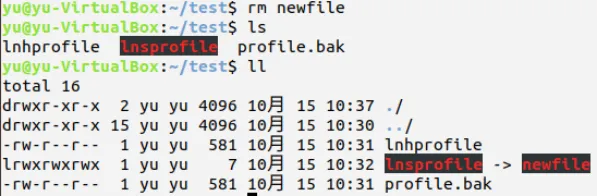 给文件newfile创建一个软链接lnsprofile和一个硬链接lnhprofile;