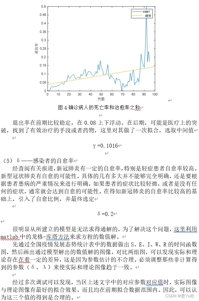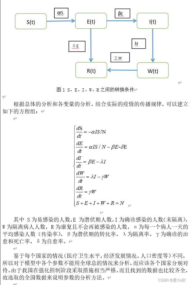 这里把中国在这次新冠疫情中的人群分为五类:S类,E类,I类,W类,R类。在总人口固定为N时,设第t天时五类人群的人数分别为S(t)、E(t)、I(t)、W(t)、R(t)。考虑自愈因素。