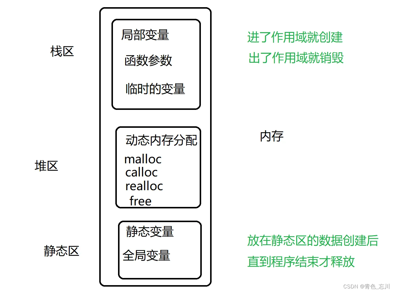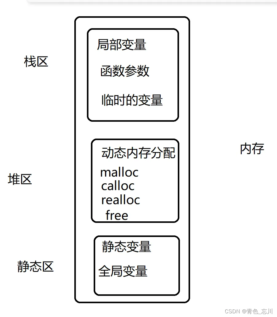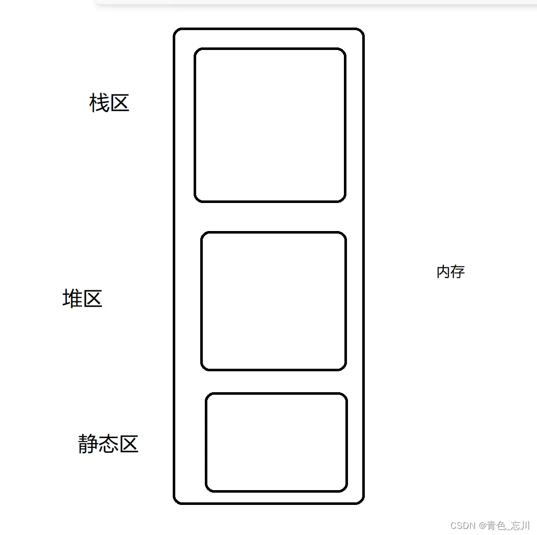 我们先画一下内存的各个区域,如图所示,我们一般将内存分为三块,分别是栈区,堆区,静态区