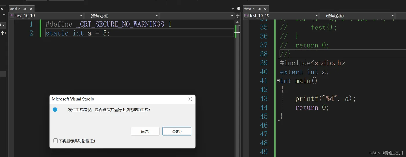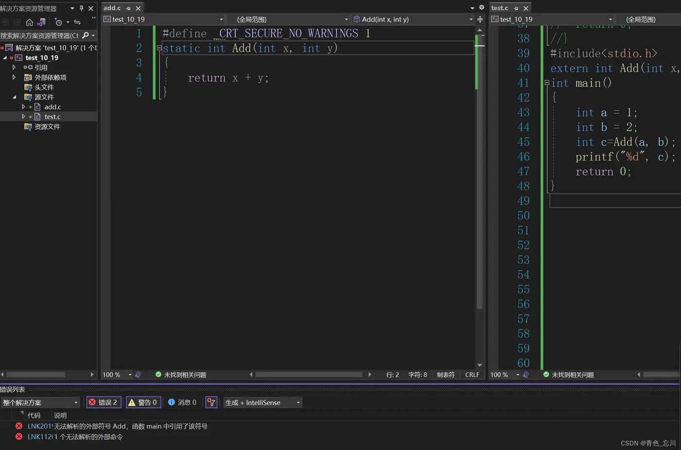 下面的报错显示,无法解析的外部符号,说明我们的Add函数无法被test.c文件识别到,static修饰函数的作用与修饰全局变量的作用就显得很类似了,使得外部链接属性变成了内部链接属性。
