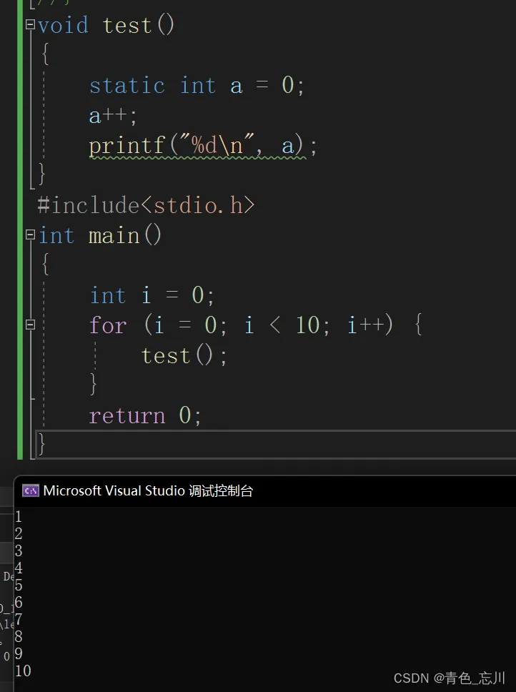 void test() { static int a = 0; a++; printf("%d\n", a); } #include<stdio.h> int main() { int i = 0; for (i = 0; i < 10; i++) { test(); } return 0; }