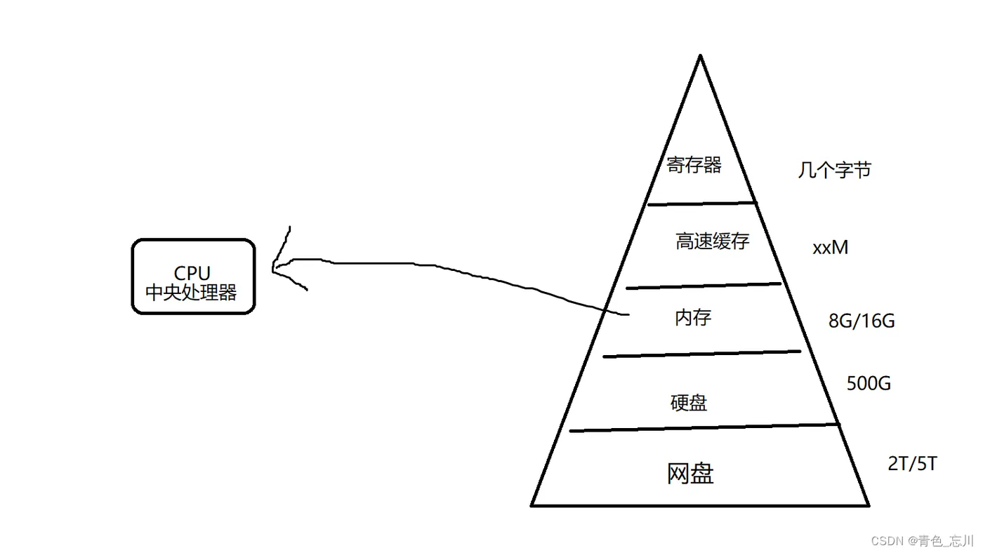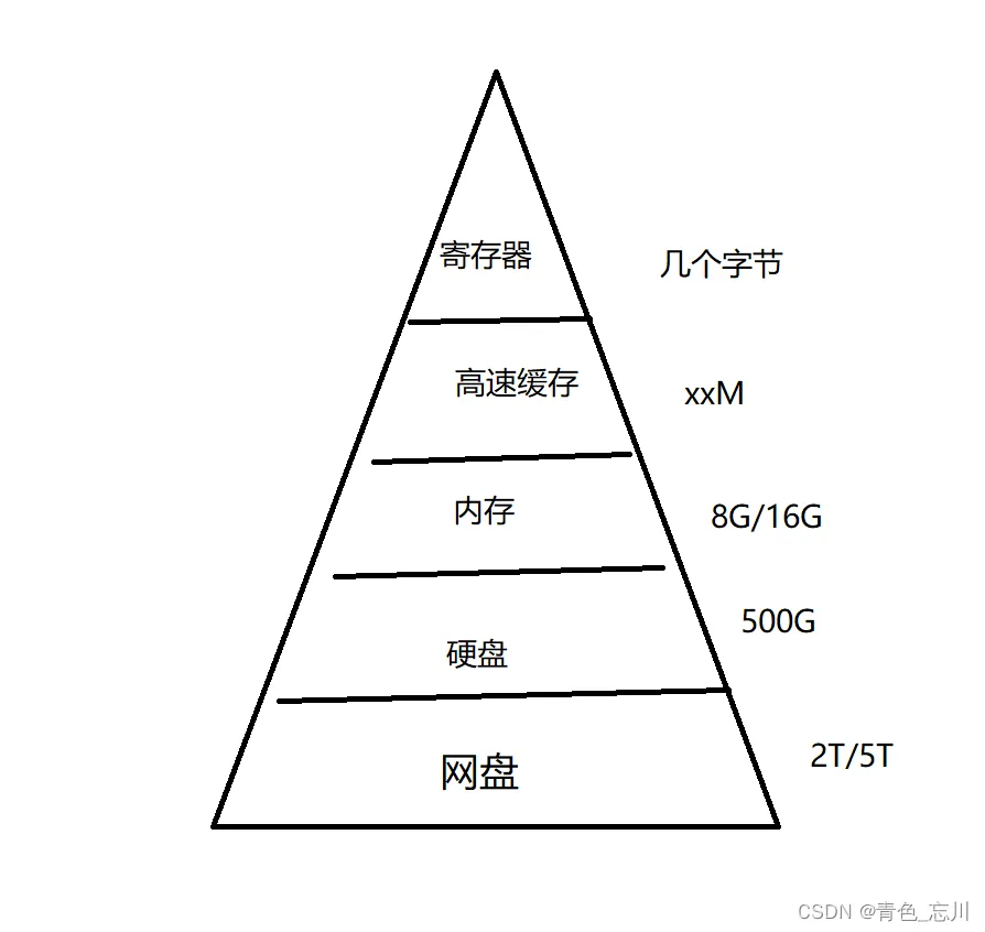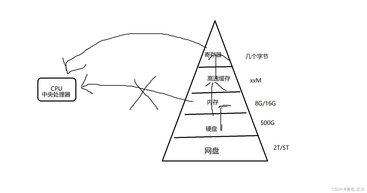 其实最核心的原因就是造价的高低,就比如我们网盘,一般只要注册了就会送1T的空间,而硬盘就需要买了,内存更贵了,从下往上越来越贵,所以上面的存储大小就很小了,下面的存储大小就比较大了。而且呢,网盘的速度,相信大家也都懂吧,硬盘的速度肯定是比网盘快的,内存的速度大于硬盘,高速缓存更快了,寄存器是最快的。
