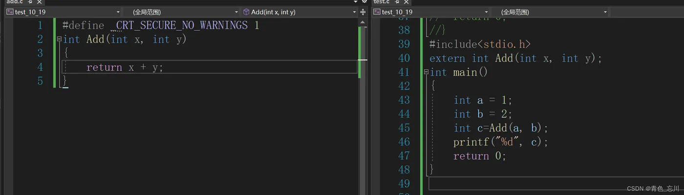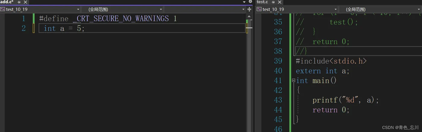 这两段代码都是全局变量的正常使用,一种是在一个.c文件内的,另外一种是两个.c文件之间使用同一个全局变量时,需要extern,这两种方式都可以使我们的程序正常运行。