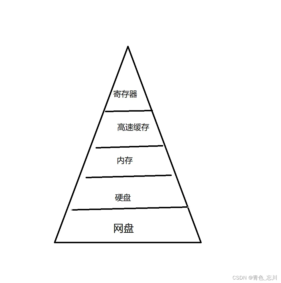 如图所示,是我们计算机中的存储器,从上到下,依次是寄存器,高速缓存,内存,硬盘,网盘(网盘一般不在电脑上,就跟我们的百度网盘一样)