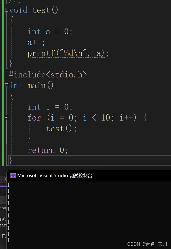 void test() { int a = 0; a++; printf("%d\n", a); } #include<stdio.h> int main() { int i = 0; for (i = 0; i < 10; i++) { test(); } return 0; }