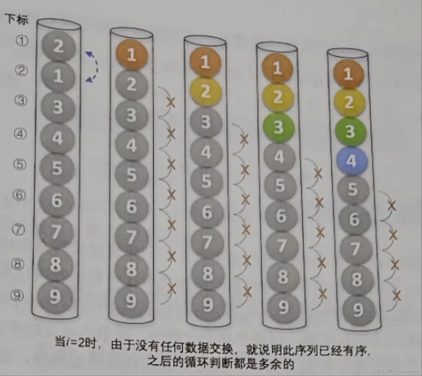 当i=1时,交换了2和1,此时序列已经有序,但是算法仍然不依不饶地将i=2~9以及每个循环中的循环都执行了一遍,尽管并没有交换数据,但是之后的大量比较还是大大地多余了,如下图所示。