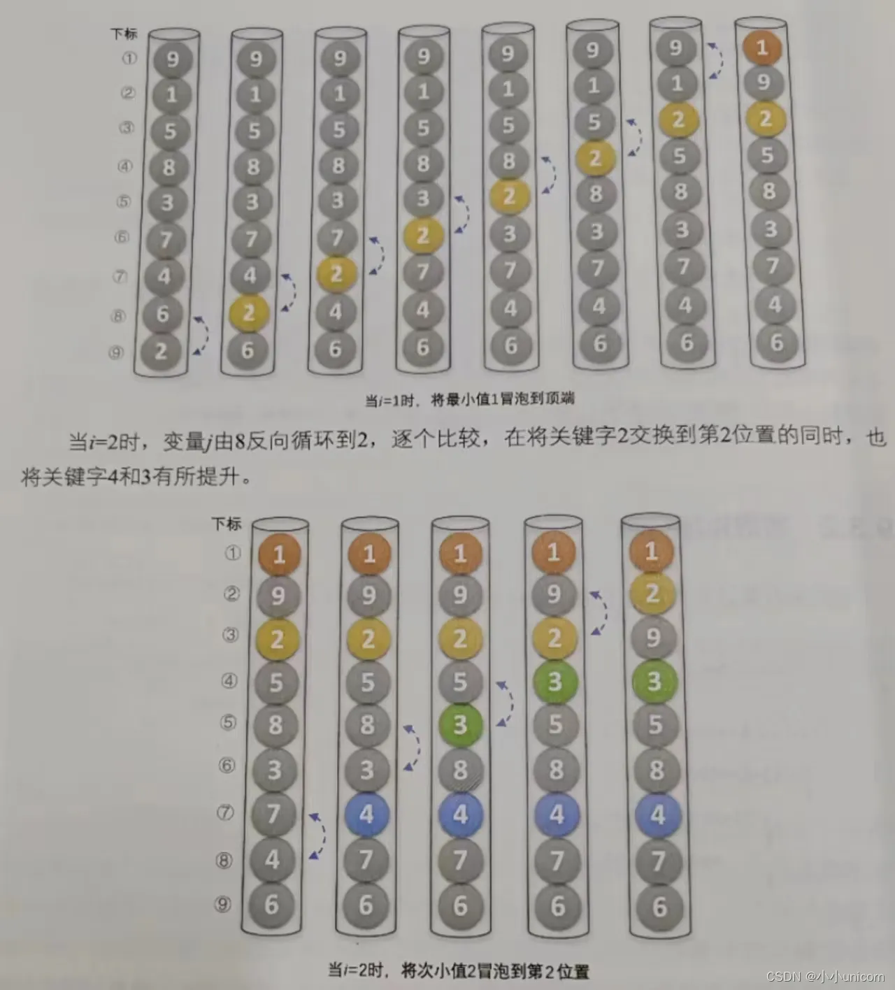 如下图所示,当i=1,j=8时,我们发现6>2,因此交换了它们的位置,j=7时,4>2,所以交换……直到=2时,因为1<2,所以不交换。j=1时,9>1,交换,最终得到最小值1放置第1的位置。