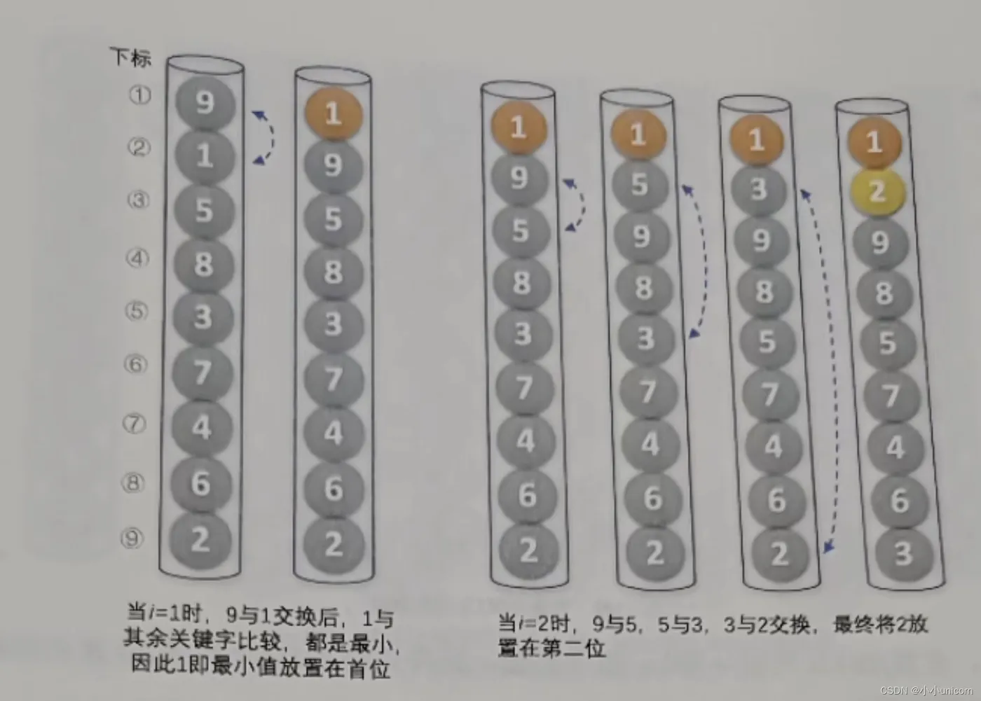 当i=2时,第二位置先后由9换成5,换成3,换成2,完成了第二小的数字交换。后面的数字变换类似,这里不再介绍。