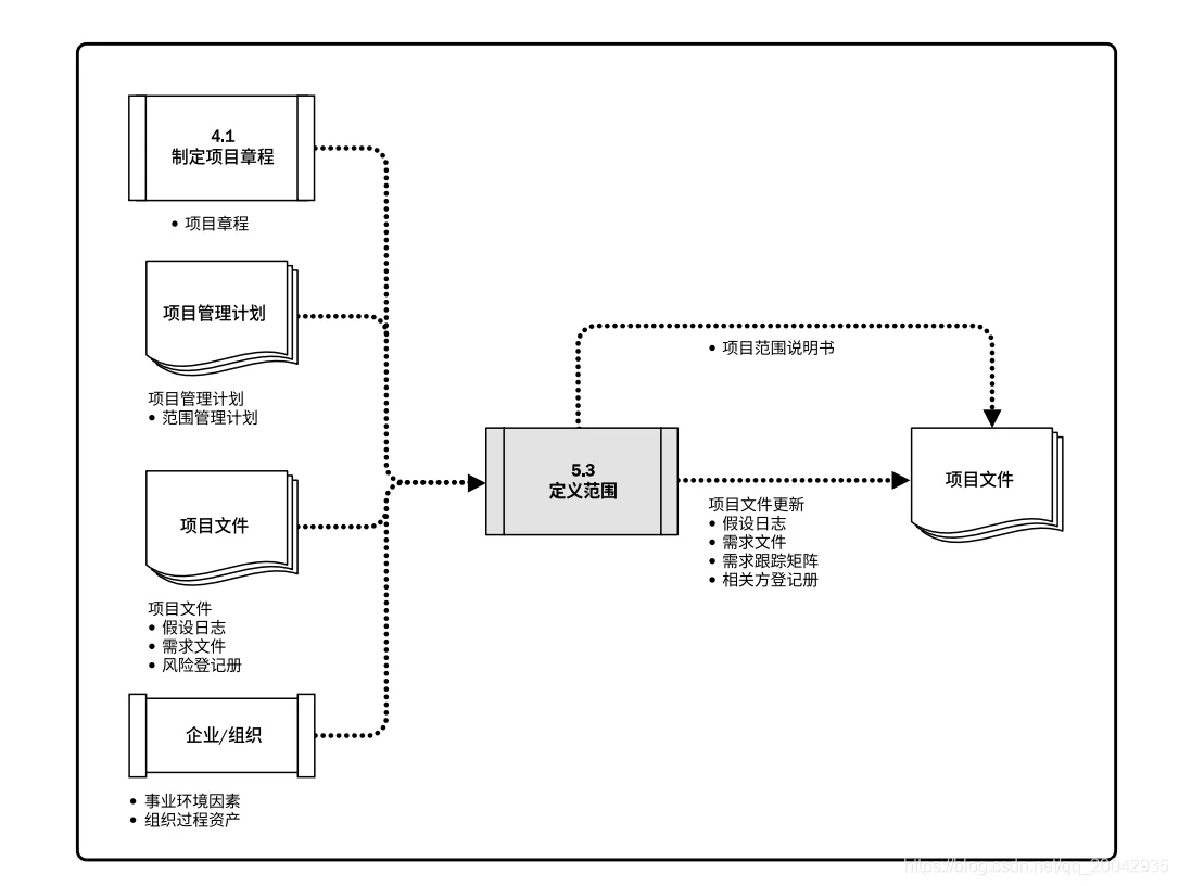 - 项目范围:为交付具有规定特性与功能的产品、服务和成果而必须完成的工作。项目范围有时也包括产品范围。
