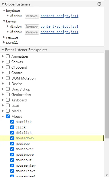 Event Listener Breakpoints中我们可以任意设置触发调试的监听事件