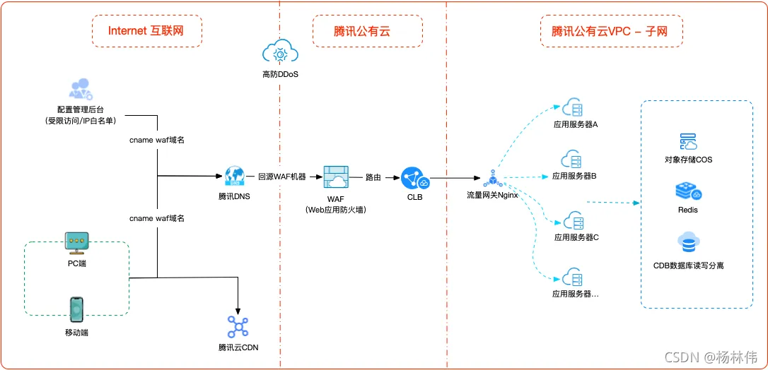 WAF> 配置负载均衡CLB> 配置流量网关Nginx> 部署应用到应用服务器 > 应用关联腾讯云相关中间件)