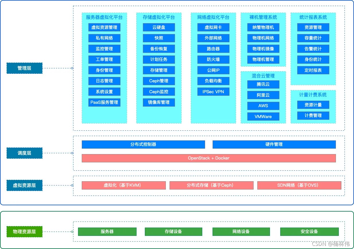 KVM、VMware等虚拟化管理,同时支持腾讯云、阿里云、AWS等公有云的管理,由云管平台统一管理。
