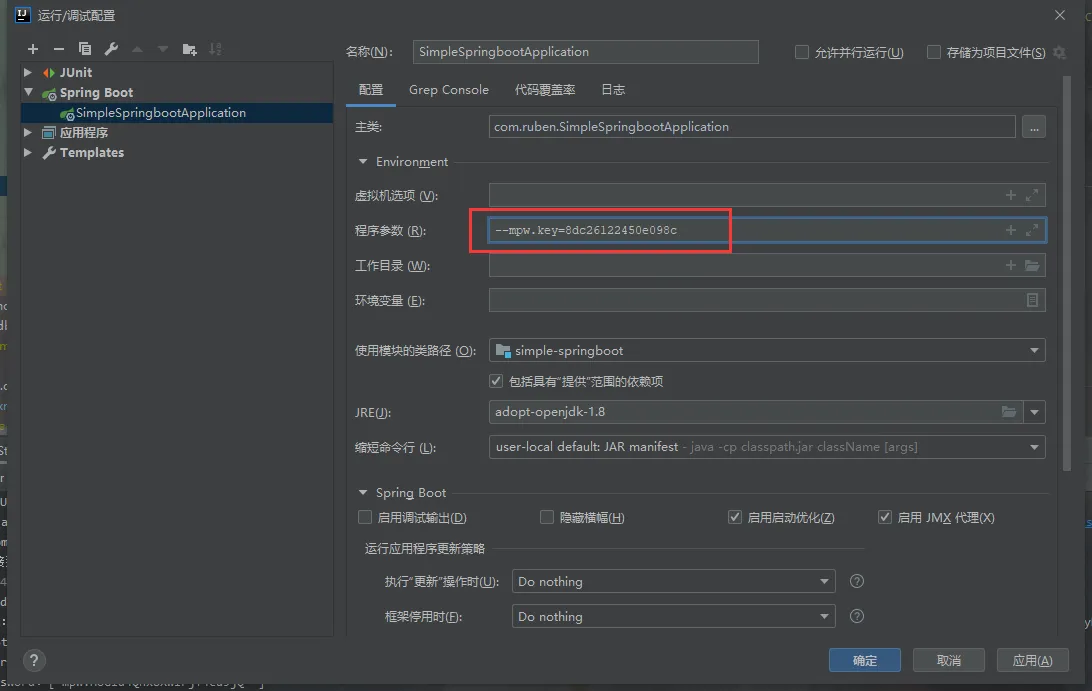然后在idea启动配置中指定--mpw.key=8dc26122450e098c