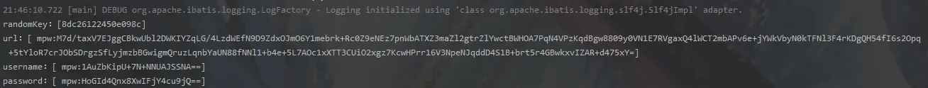 public static void main(String[] args) throws Throwable { // 生成 16 位随机 AES 密钥 String randomKey = AES.generateRandomKey(); // 随机密钥加密 String url = AES.encrypt("jdbc:mysql://localhost:3306/ruben?autoReconnect=true&zeroDateTimeBehavior=CONVERT_TO_NULL&useUnicode=true&characterEncoding=utf-8&useSSL=false&nullCatalogMeansCurrent=true&serverTimezone=Asia/Shanghai&allowMultiQueries=true", randomKey); String username = AES.encrypt("root", randomKey); String password = AES.encrypt("789456", randomKey); System.out.println("randomKey:[" + randomKey + " ]"); System.out.println("url:[ mpw:" + url + " ]"); System.out.println("username:[ mpw:" + username + " ]"); System.out.println("password:[ mpw:" + password + " ]"); }
