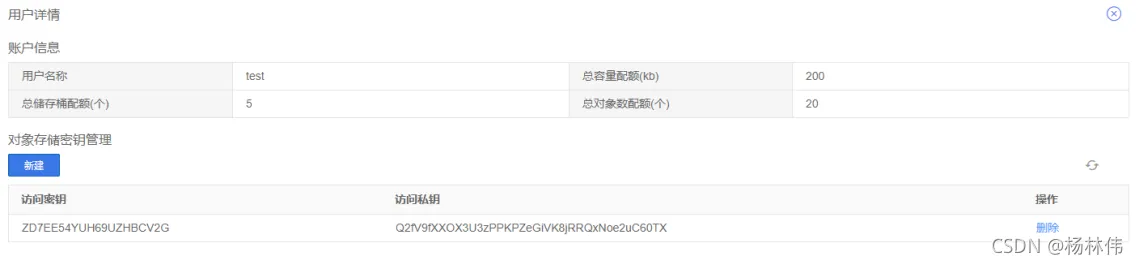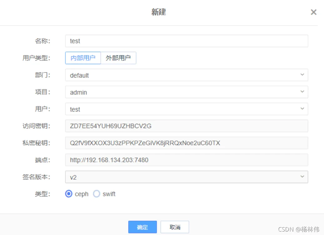 启用Ceph对象存储功能后,配置使用对象存储的用户名称及资源配额,系统自动配置用户的存储秘钥,用于配置对象存储。