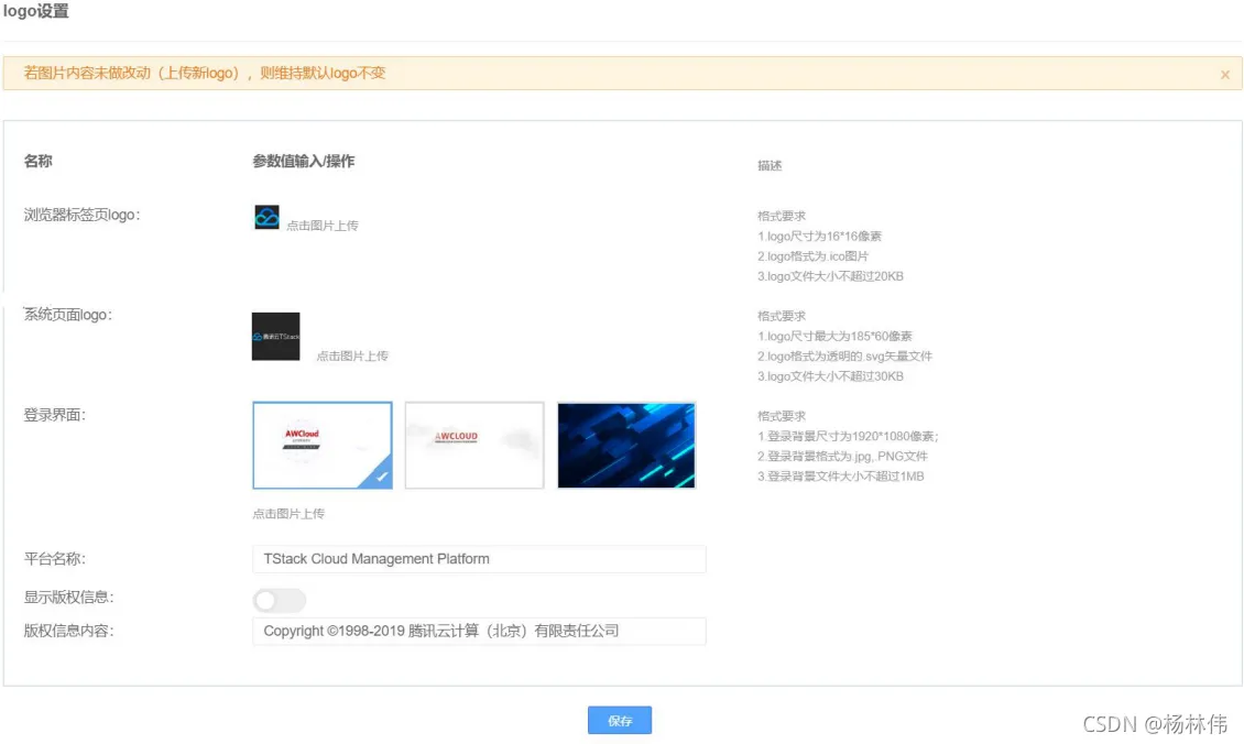云管平台安装部署完成后,用户可以登录到云管平台,根据实际需求更换平台所对应的Logo、登录页面及版权信息。