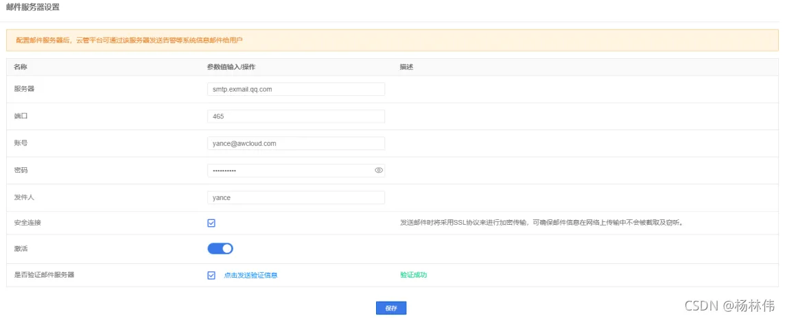 设置云管平台发送邮件(比如发送告警信息)的账号。当云骨干平台触发了指标阈值告警时,将告警信息通过邮件发送给相关联系人。