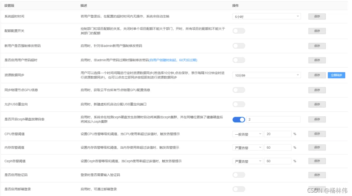 用户根据需要修改云管参数和云服务相关参数配置,包含系统超时时间、配额管理开关、强制修改密码、回收站过期时间等。