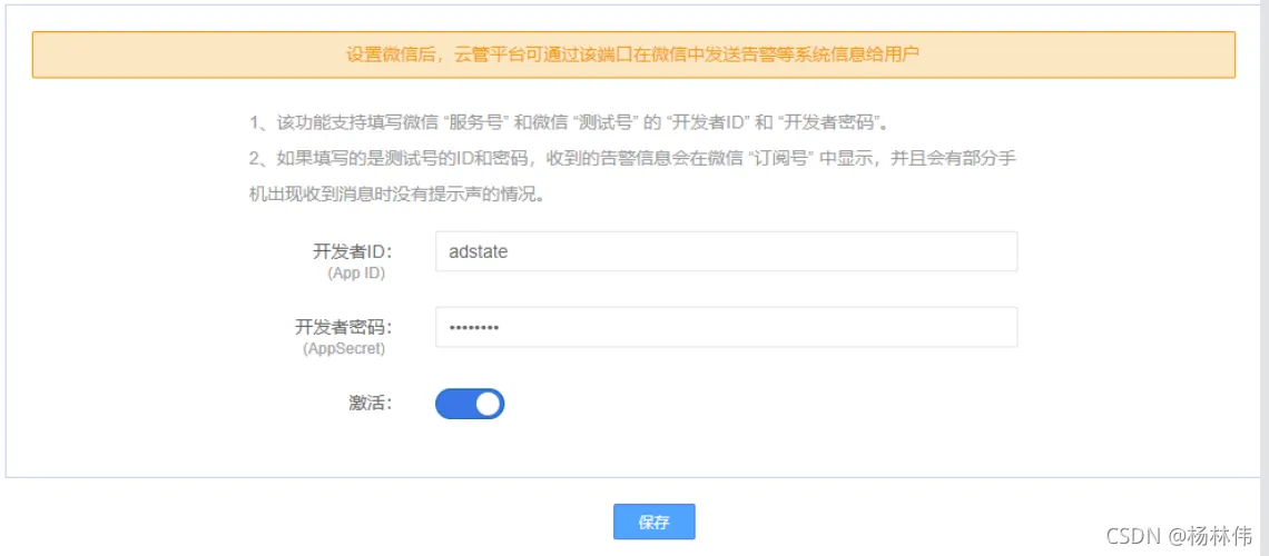 设置云管平台发送微信(比如发送告警信息)的公众号。当云管平台触发了指标阈值告警时,将告警信息通过微信推送给已关注公众号的人员。
