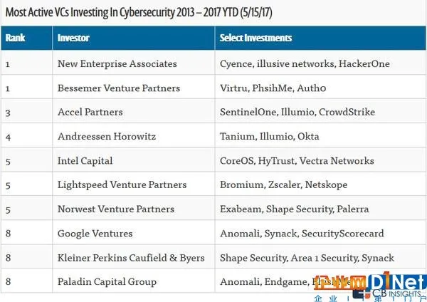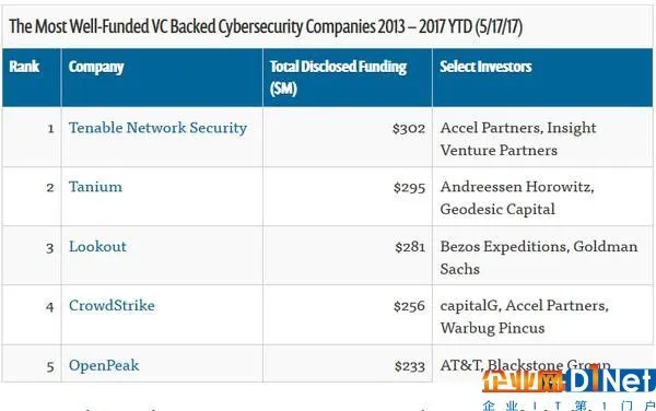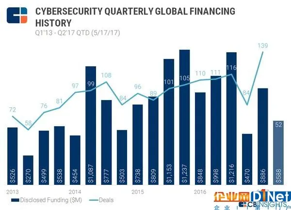 截至到5月17日,2017年网络安全领域仅有一宗1亿美元以上投资交易,即CrowdStrike获得的1亿美元D轮融资。