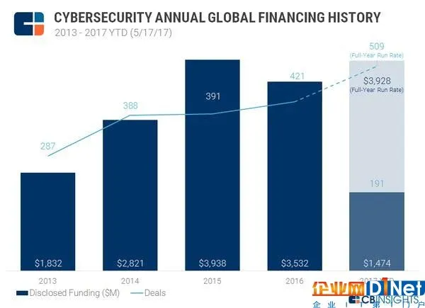 自2013年以来,网络安全初创企业投资一直呈上升趋势,去年该领域实现超过400宗投资交易(获得35亿美元投资),创下新的纪录。过去两年,该领域投资额都超过30亿美元。按照当前的增速,2017年网络安全领域投资交易将继续保持增长趋势,投资额将超过去年水平,接近2015年的高峰。