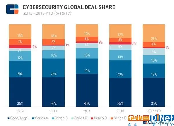 自2013年,网络安全领域投资交易仍以早期阶段为主,种子和A轮投资占比超过50%。值得关注的是,B轮投资份额正在增长。