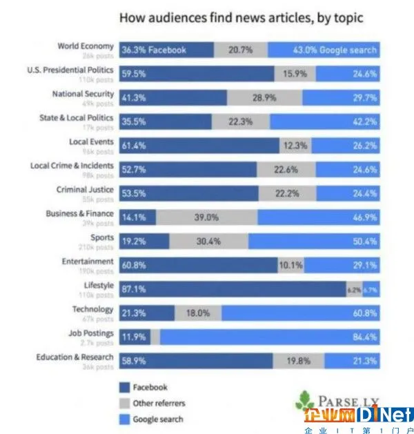 下图是Parsely的统计数据,谷歌和Facebook的统治在不同的新闻领域呈此消彼涨的状态。Parsely这份研究报告足够有说服力,这是它们对超过100万条网络新闻进行研究的结果。