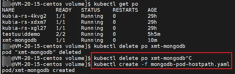 然后删除这个 mongodb Pod 后,重新启动一个一模一样的 mongodb Pod