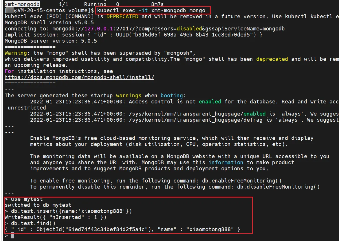 > use mytest switched to db mytest > db.test.insert({name:'xiaomotong888'}) WriteResult({ "nInserted" : 1 }) > db.test.find() { "_id" : ObjectId("61ed74f43c34bef84d2f5a4c"), "name" : "xiaomotong888" }