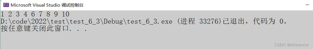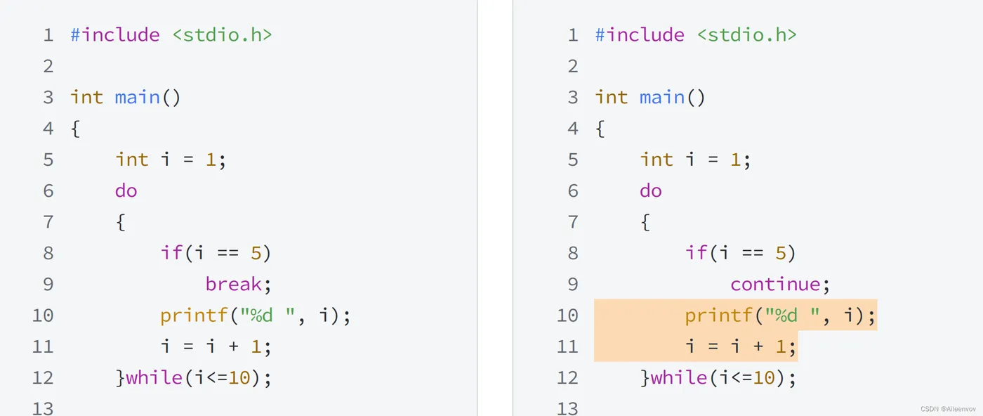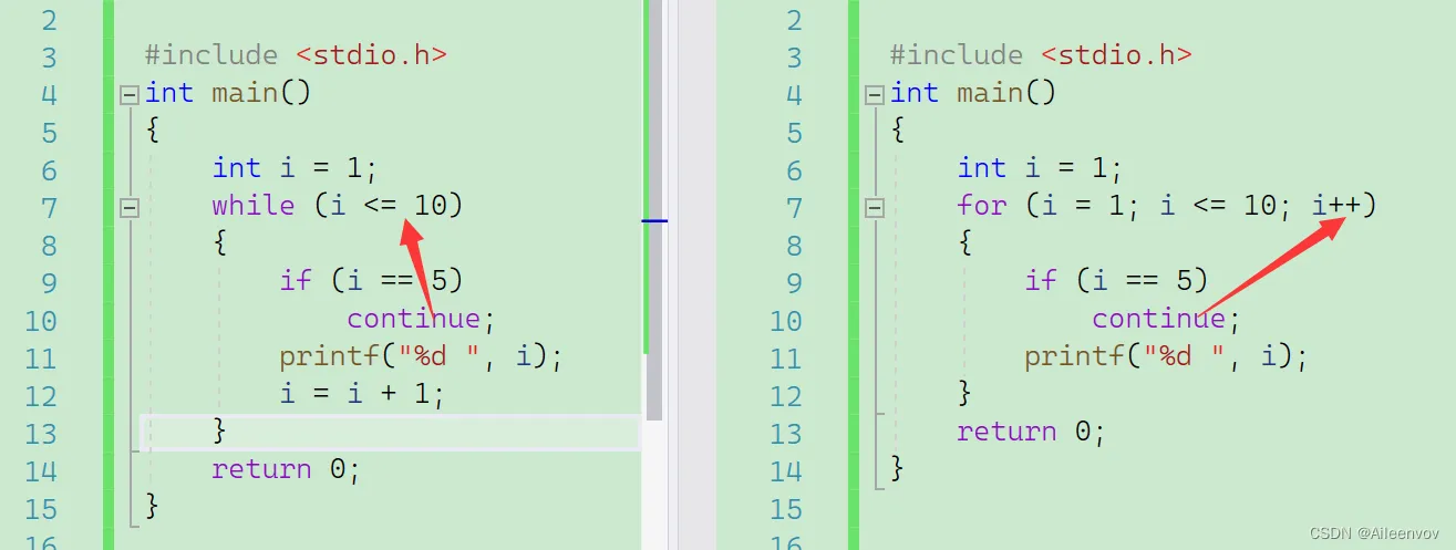 #include <stdio.h> int main() { int i = 1; for(i=1; i<=10; i++) { if(i == 5) continue;//这⾥continue跳过了后边的打印,来到了i++的调整部分 printf("%d ", i); } return 0; }