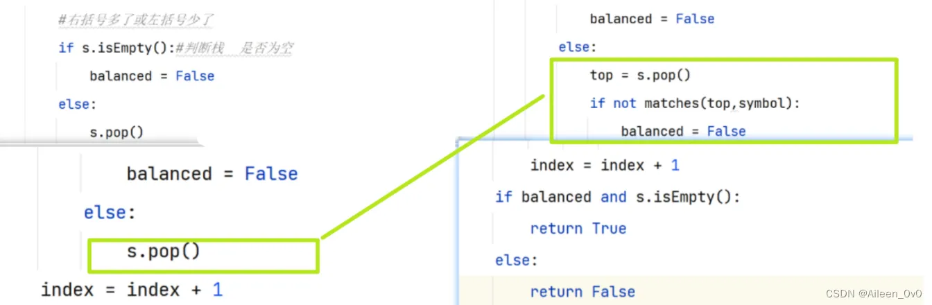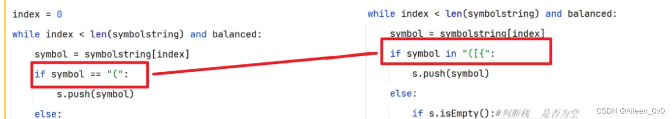 左边代码:单独判断括号是否匹配,为了防止用户输入其它类型的括号进行匹配,所以用==去限制匹配的括号类型