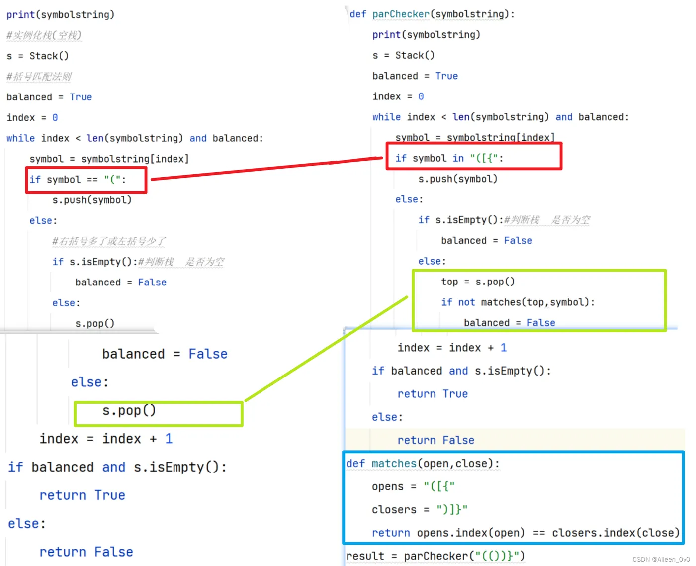右边代码:因为字符串相当于列表,如果是各种类型的括号,用in的话相当于检查列表中某个元素是否存在,每种类型的括号都可以进行一一匹配